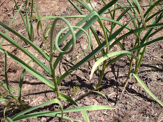 Plus, I transplanted a dozen volunteers. They were from a bed where we grew garlic two years ago, so they would have sprouted the fall/spring of 2011/12 and formed what's known as "rounds" last year. They should produce at least a couple cloves each this year, but the heads (and cloves) will likely be smaller than the ones produced from cloves planted last fall.